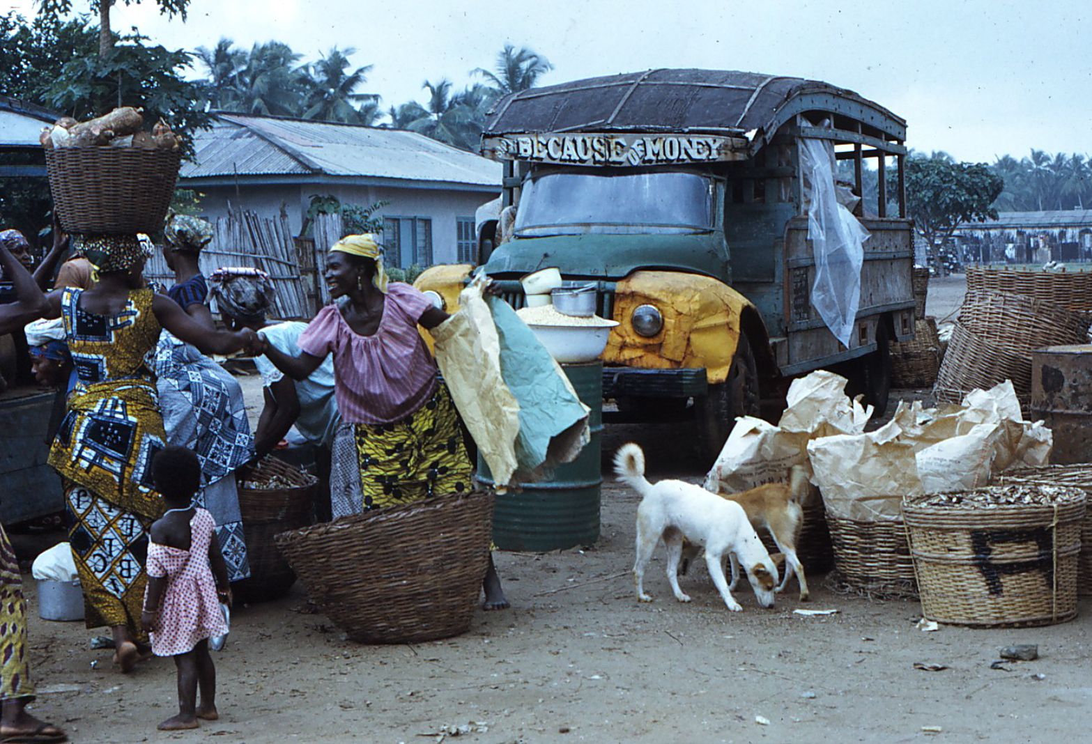 In this scene outside the Half Assini Market in 1973, we see women negotiating prices for their commodities (smoked fish and yams) and a mammy lorry waiting to carry them home with their wares.