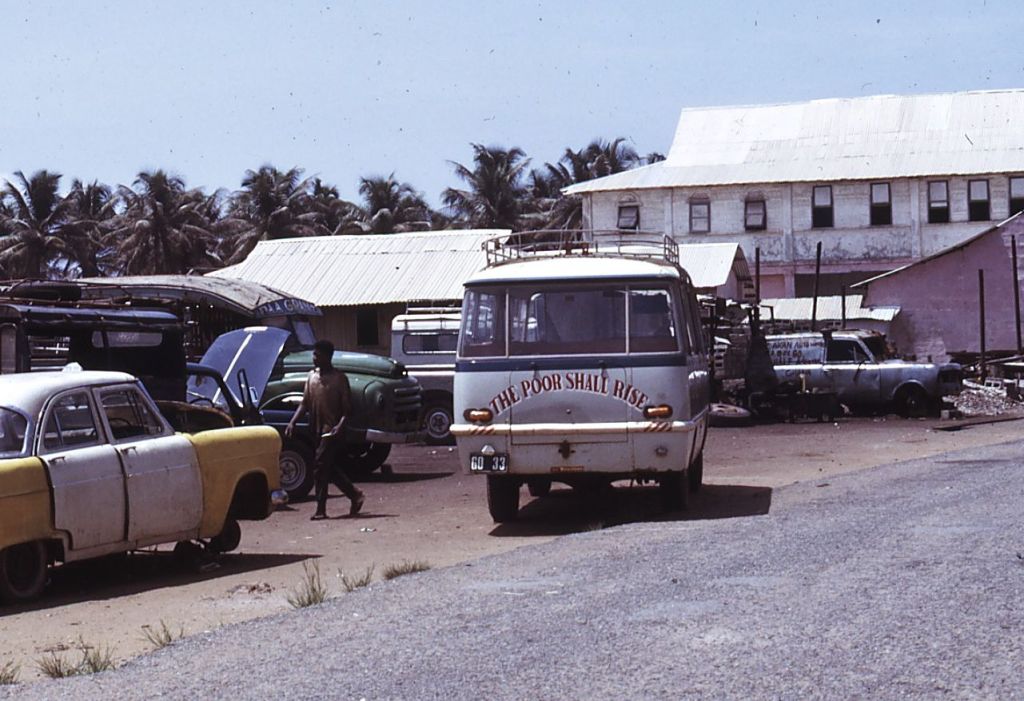 This lorry sat on the side of the street for the entire time that I lived in Half Assini in the Western Region of Ghana, from 1971 to 1973. I was told that it was waiting for repairs which was not surprising since that was a time when vehicle parts were very much in short supply in the country. The roadside fitters were (and still are) very adept at finding ways of keeping vehicles on the road, often fabricating replacements from a variety of unlikely sources. At times, even their ingenuity encountered situations which were impossible to remedy without original parts. The effect was to leave drivers and their mates without jobs; the lorry owner unable to earn anything for his investment; and villagers with one less means to get to market.