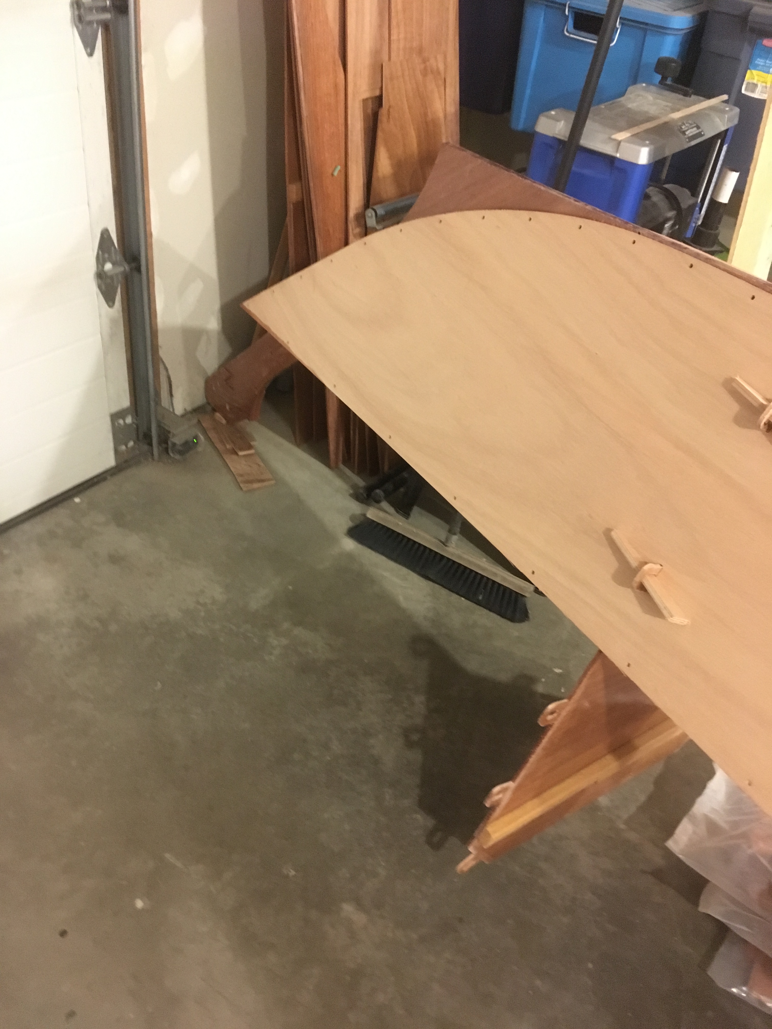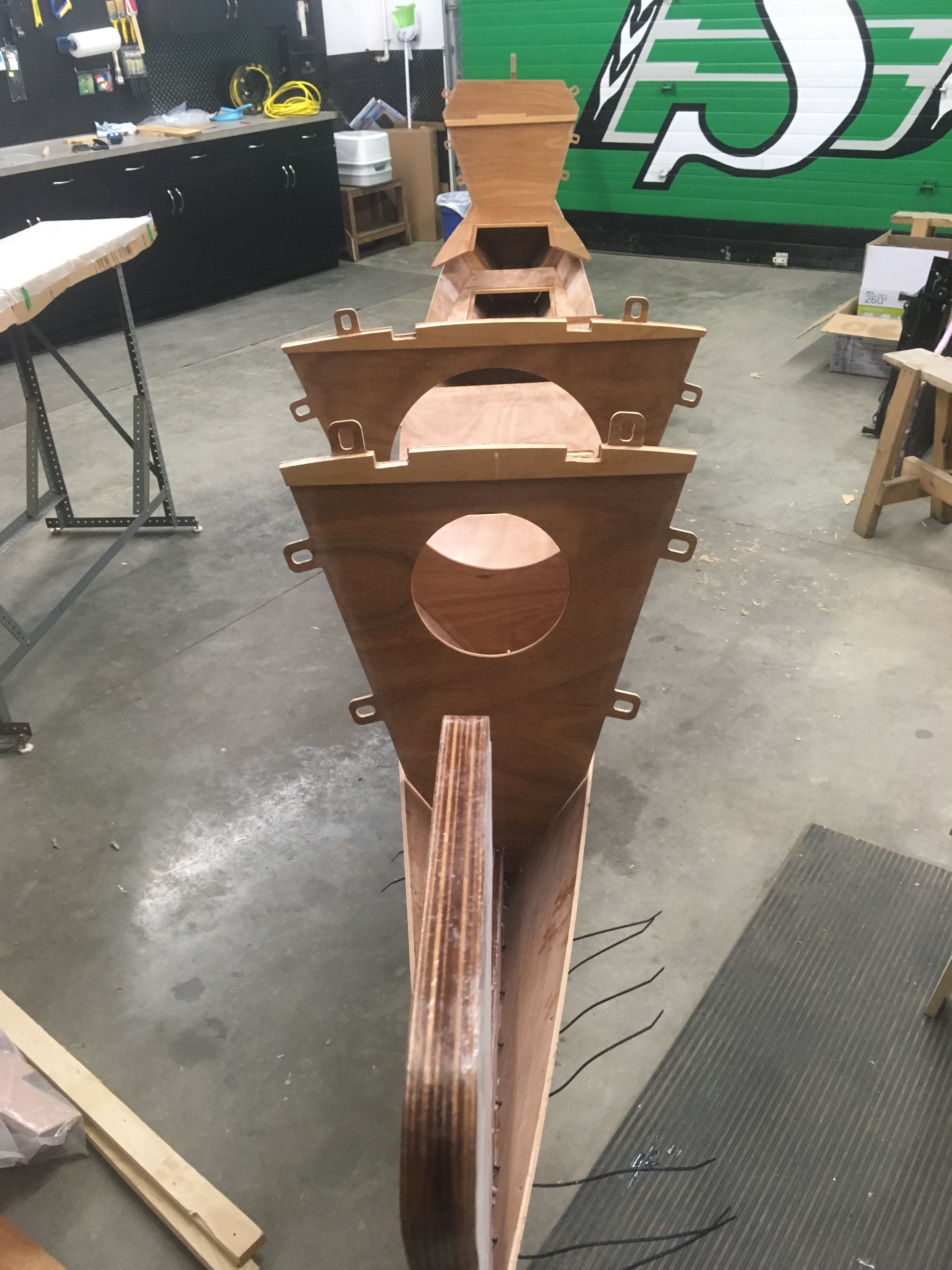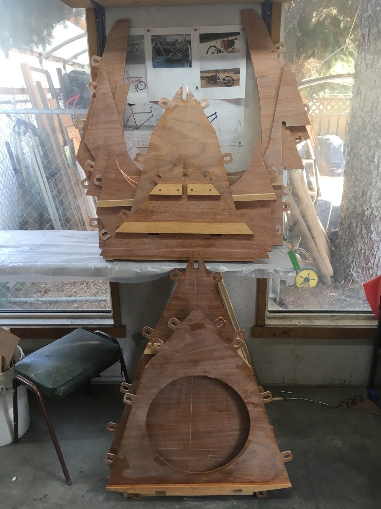 Most of the plywood used for bulkheads has its first coat of epoxy already applied, allowing work to proceed quickly.