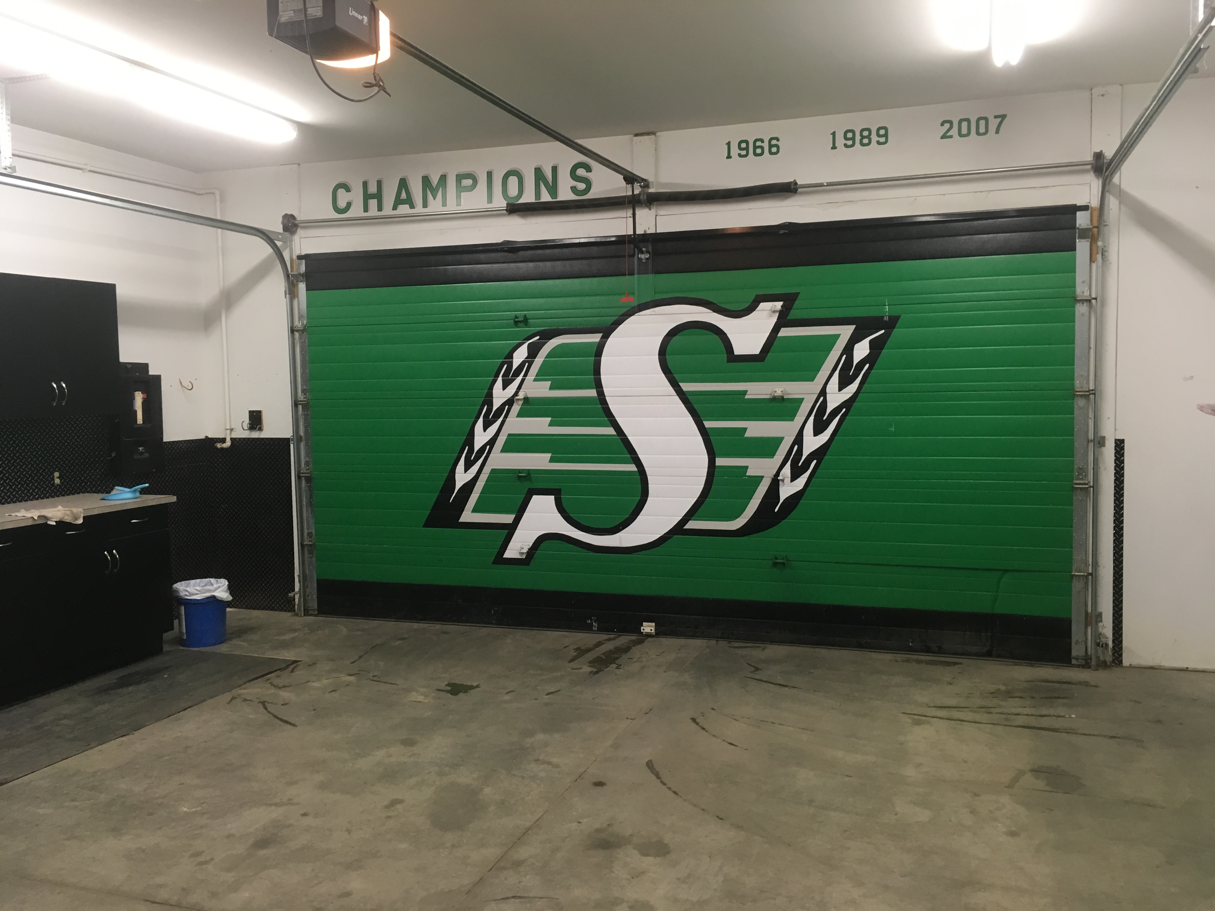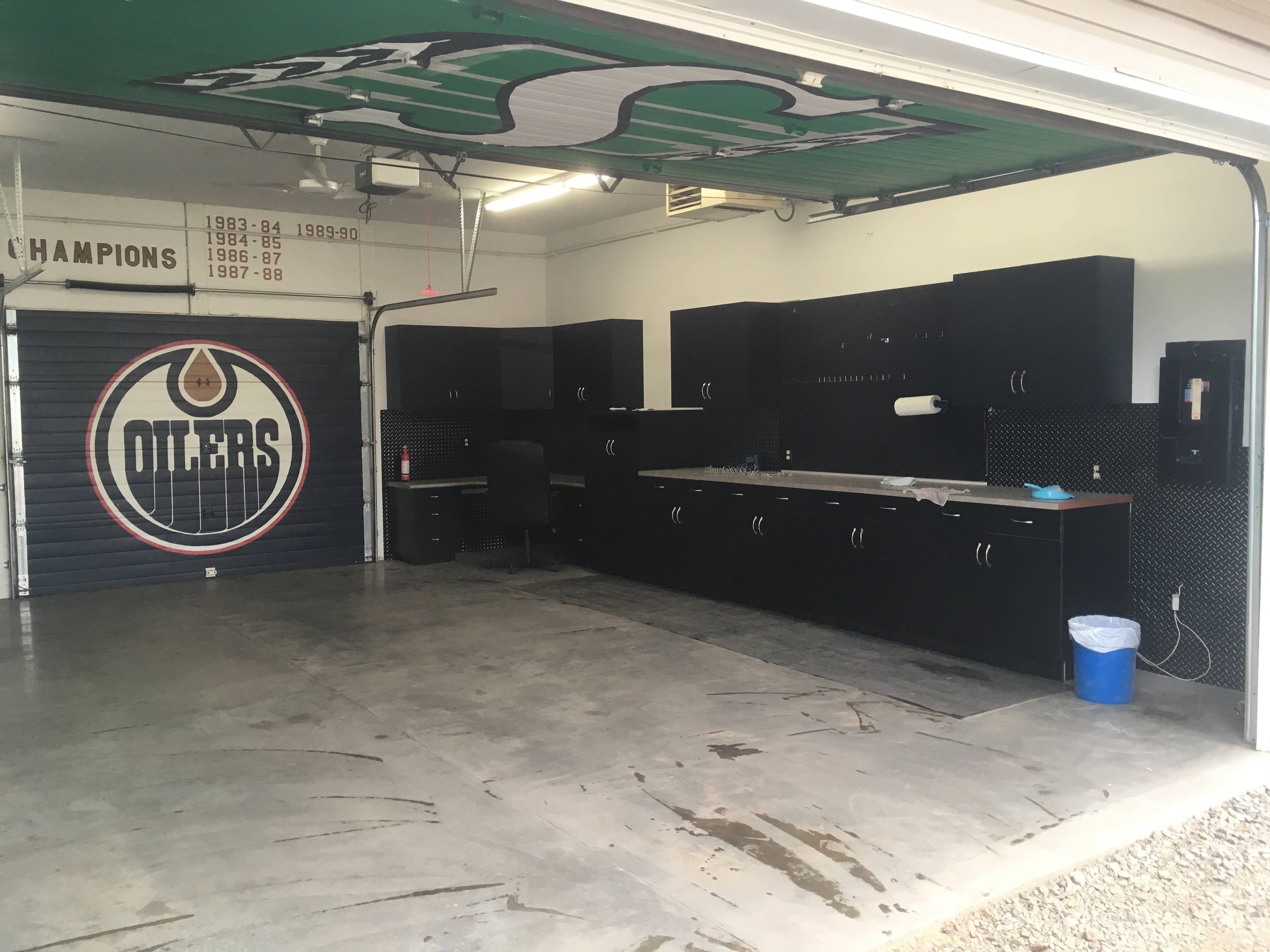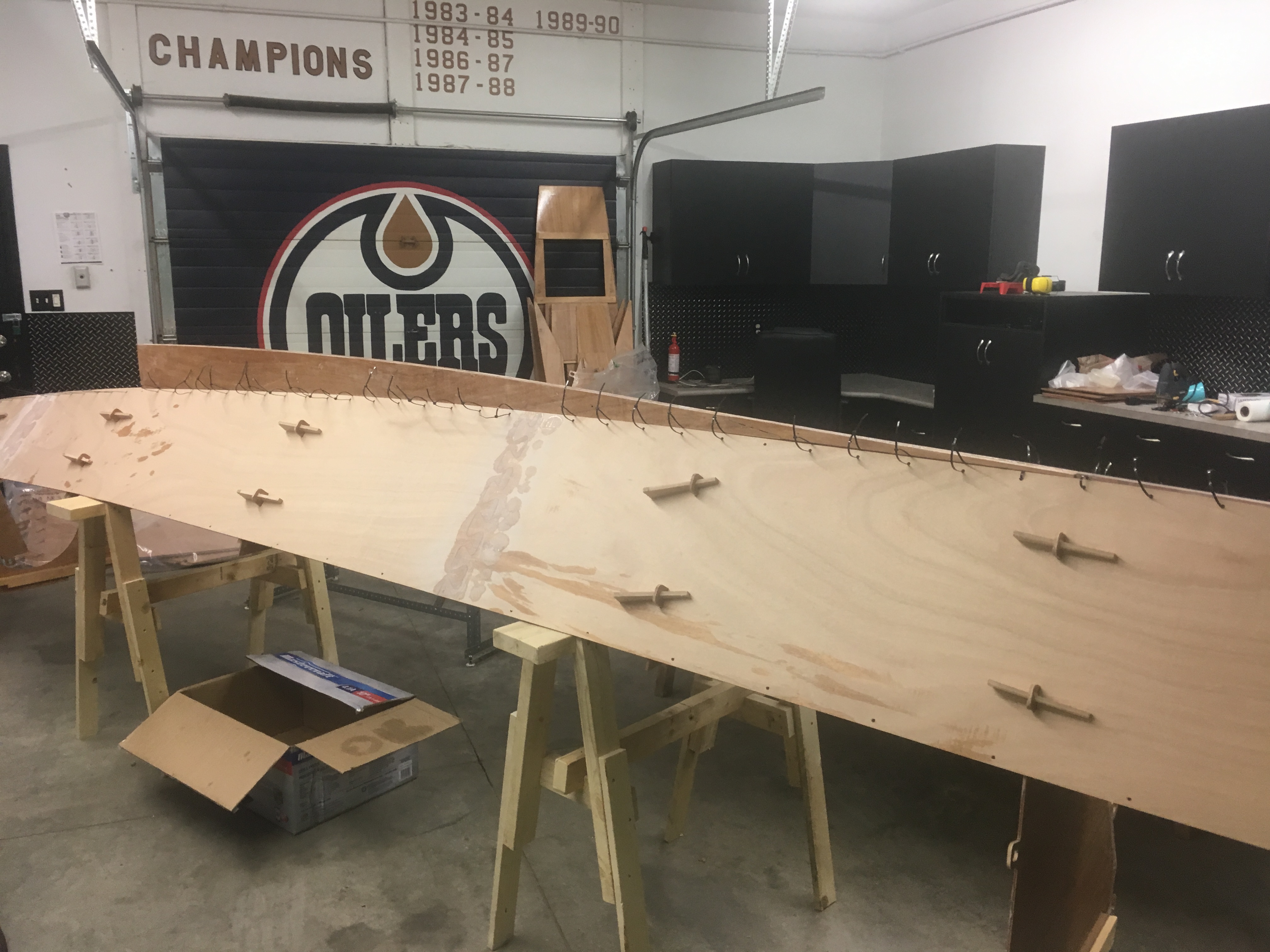 Even with only one hull set diagonally in the garage, the stem and stern posts could not be added. Fortunately, my quest for a better option was successful and a new place became available just a block from home – a heated two car garage, inside dimensions 23 feet x 23 feet, leaving space for two hulls to be constructed at the same time when placed diagonally. The garage is well lit, with cupboards, pegboard and counter on one wall for tools and supplies. It also features graphics that would gladden the hearts of professional sports fans in this part of the world – check these out: