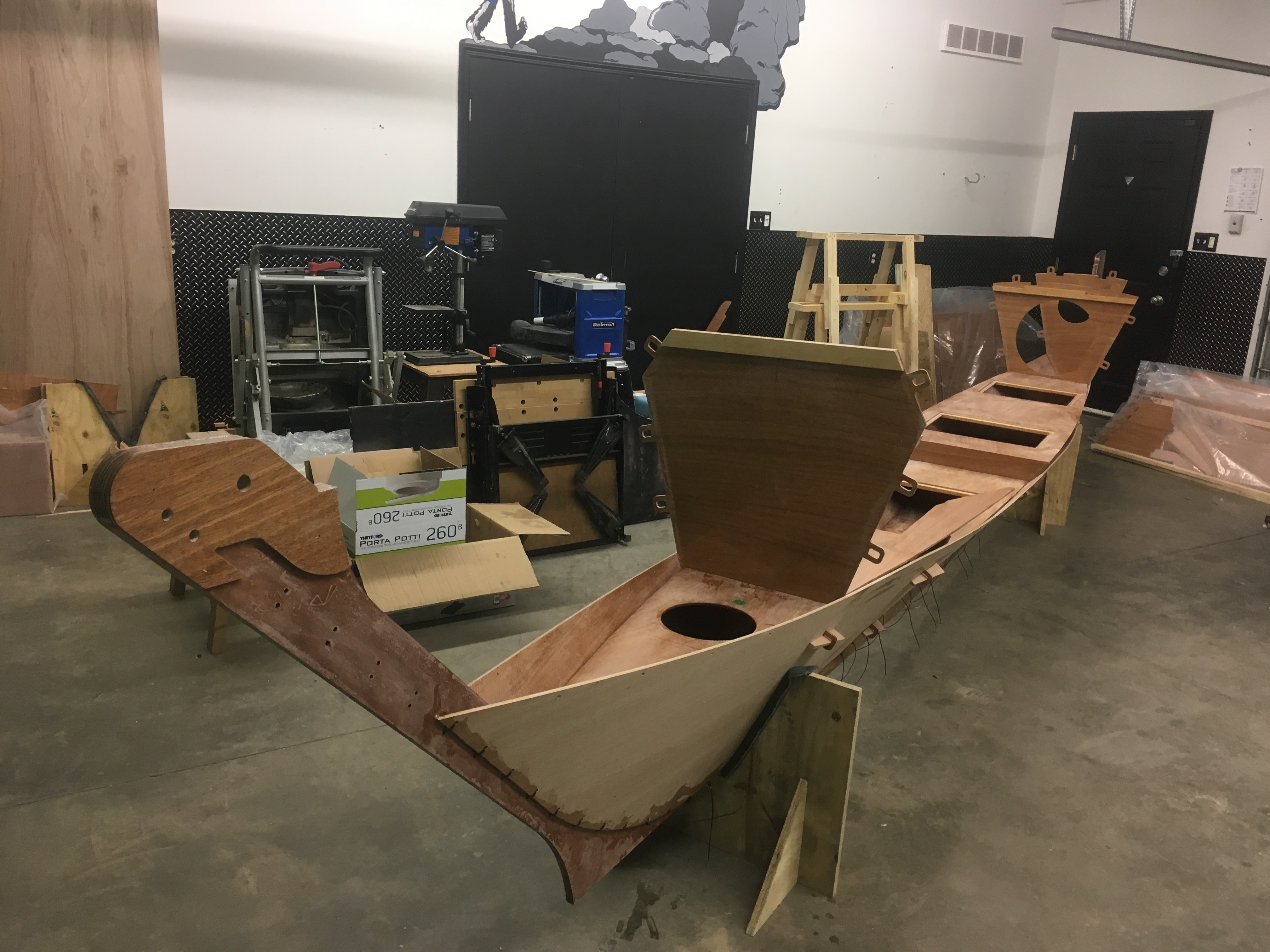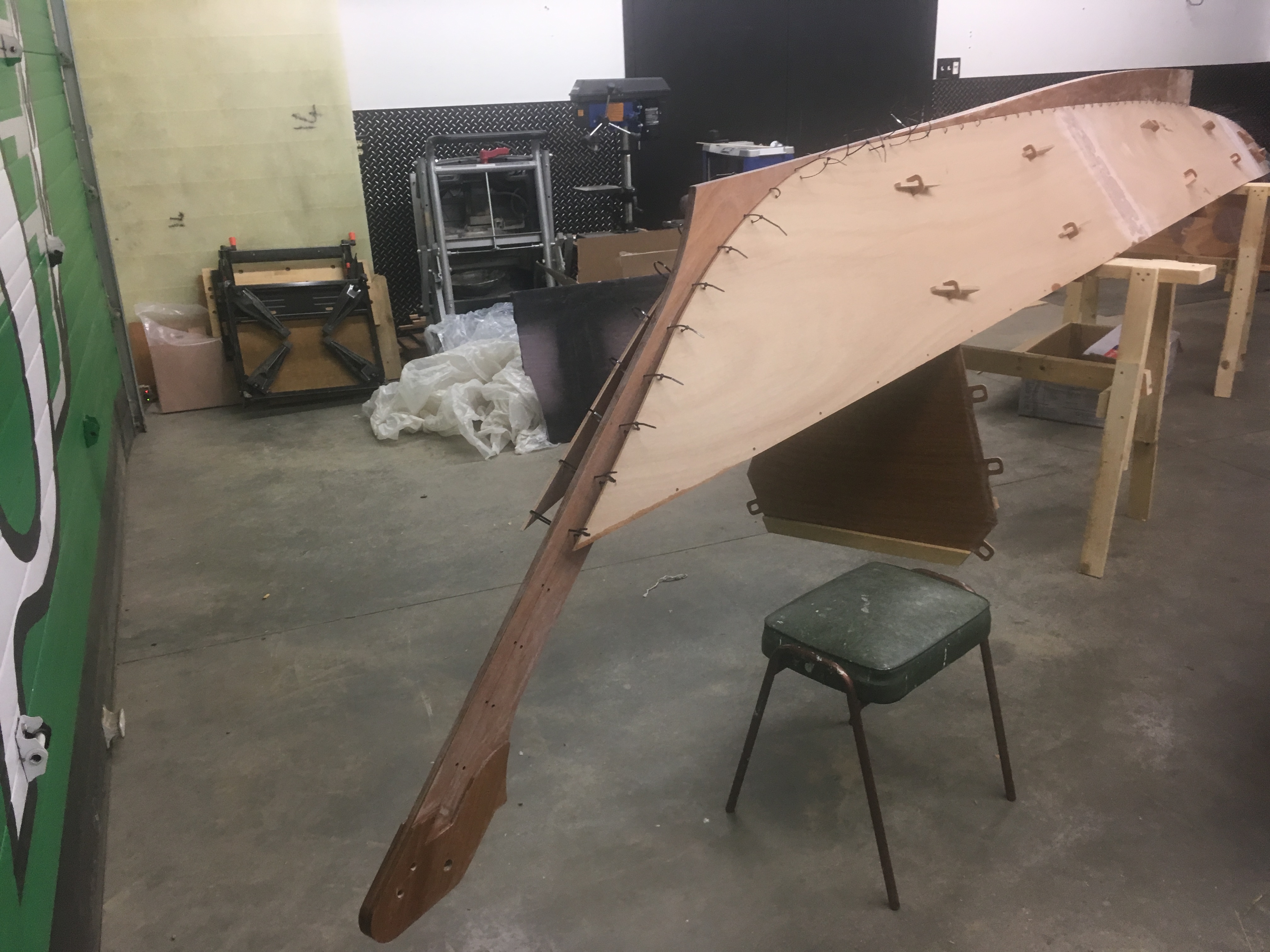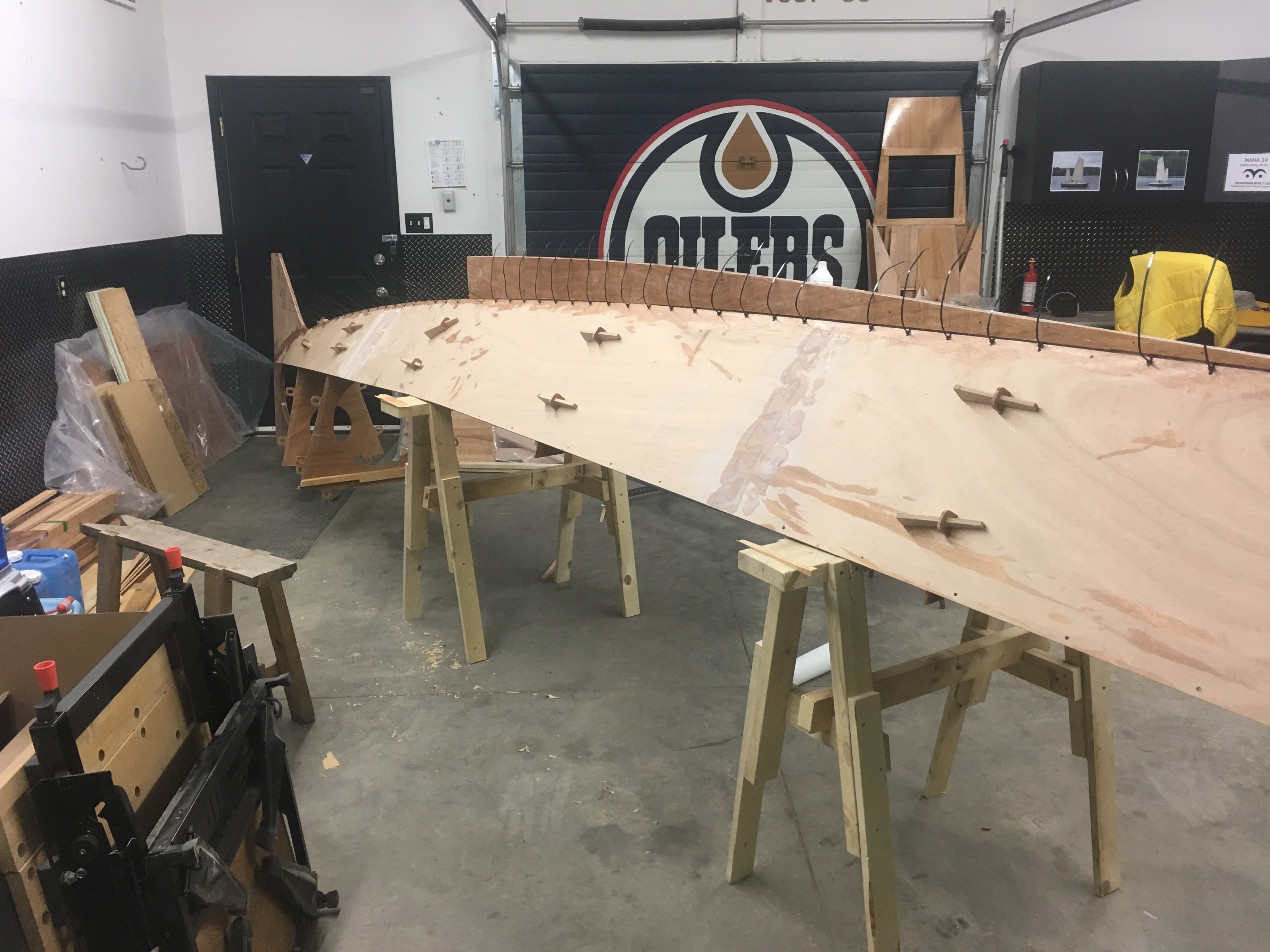 What are the necessary ingredients for a boat building workshop? For starters, adequate space is an essential element, and it was clear when I began building the Mana 24 our garage was not long enough for two 23 1/2 foot hulls to be constructed at the same time.