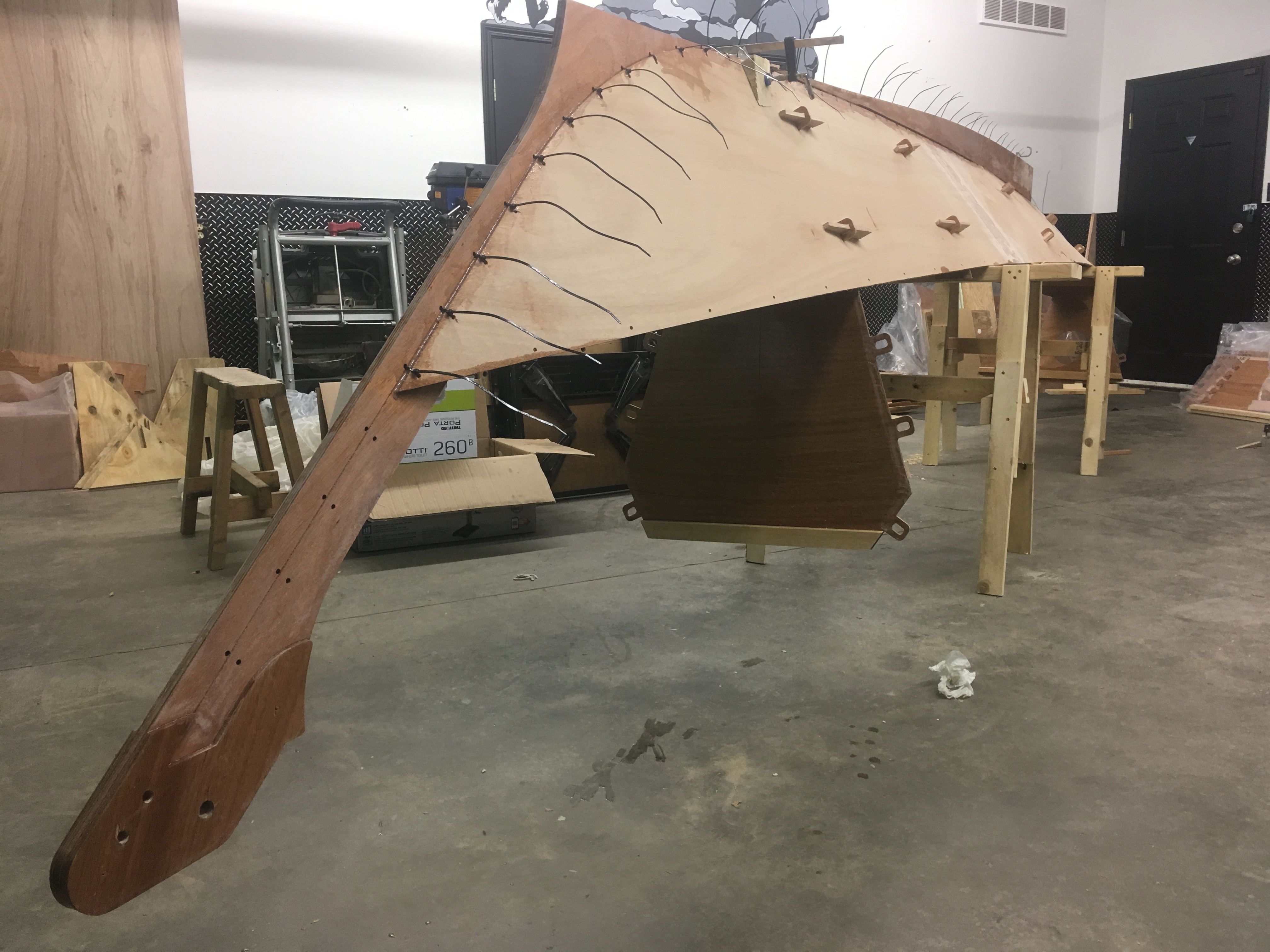 The photo at the top of the post shows the keel along with bulkheads 1, 2 and 3 attached. In the next photos, the bottom panels were then slotted onto the bulkheads and temporarily held in place with the ingenious use of tabs and wedges.  The stem and stern posts were added, and stitched in place using zip ties. The precision of CNC cut components ensured that the bulkheads would be aligned correctly. Zip ties inserted into pre-cut holes made quick work of pulling the various components into a shape clearly resembling a boat.