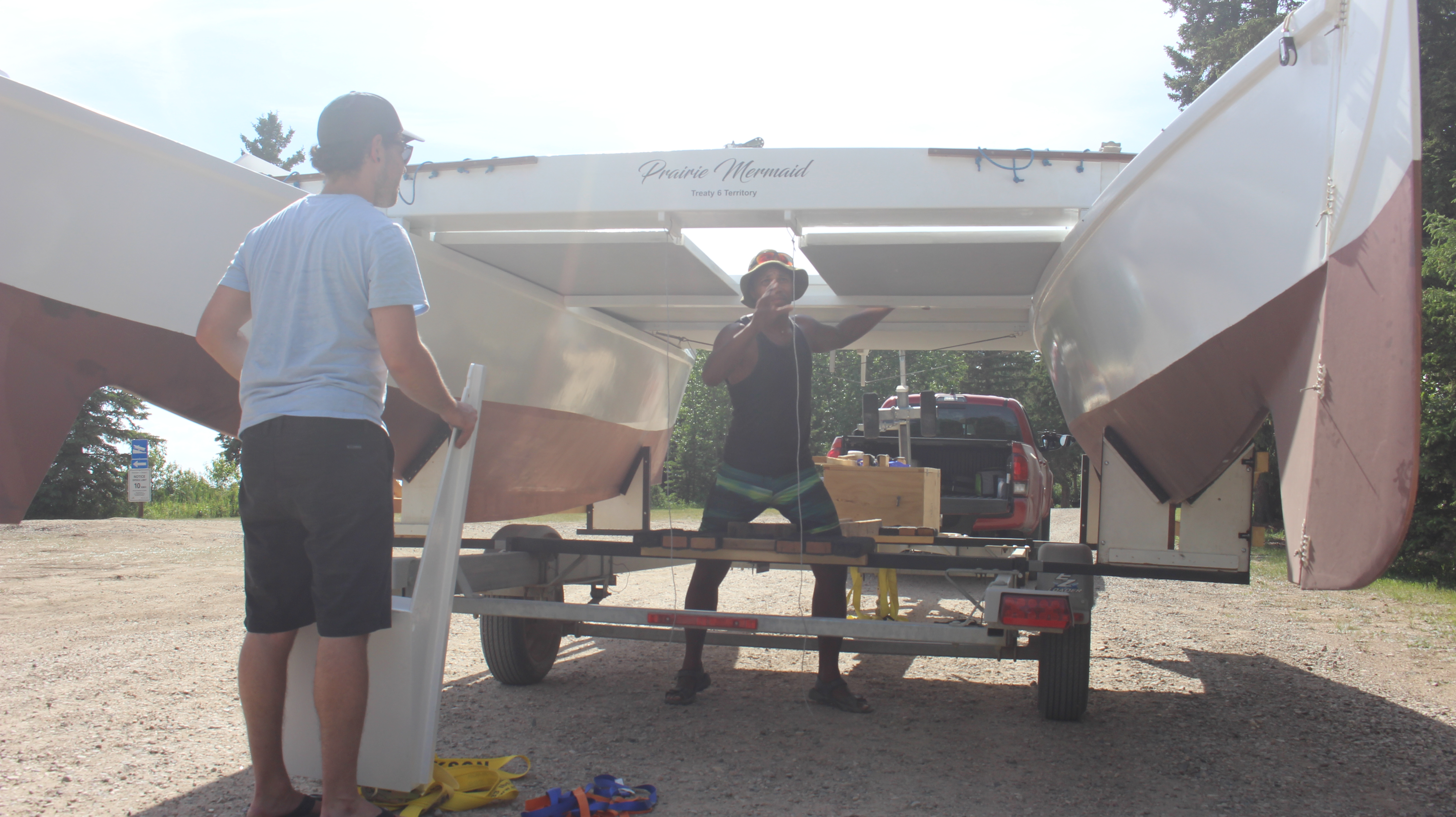 It was time to add a boat to the mix. With the help of my sailing buddy and his very strong roommate, the hulls were moved out of the garage and loaded onto the trailer.