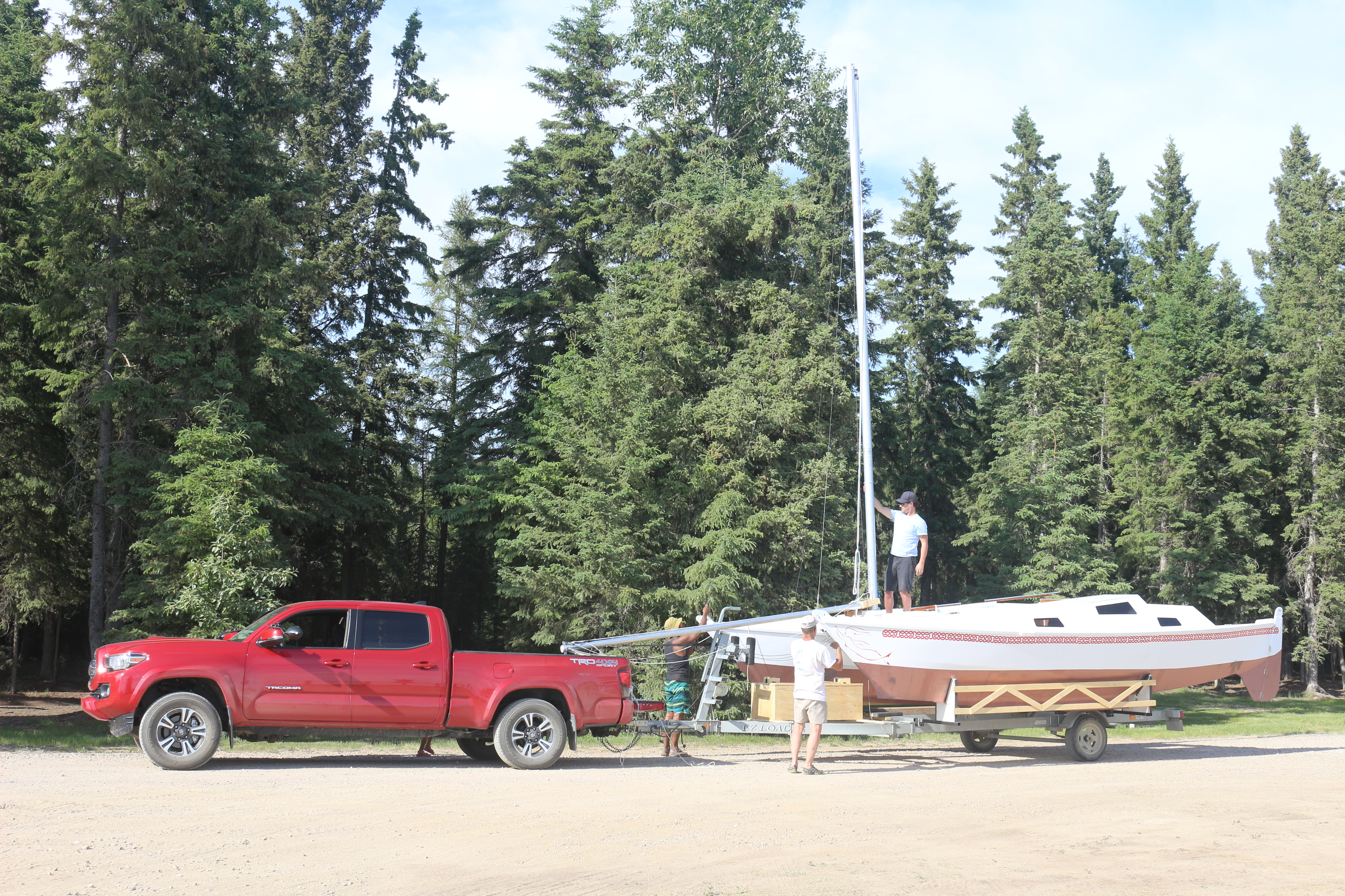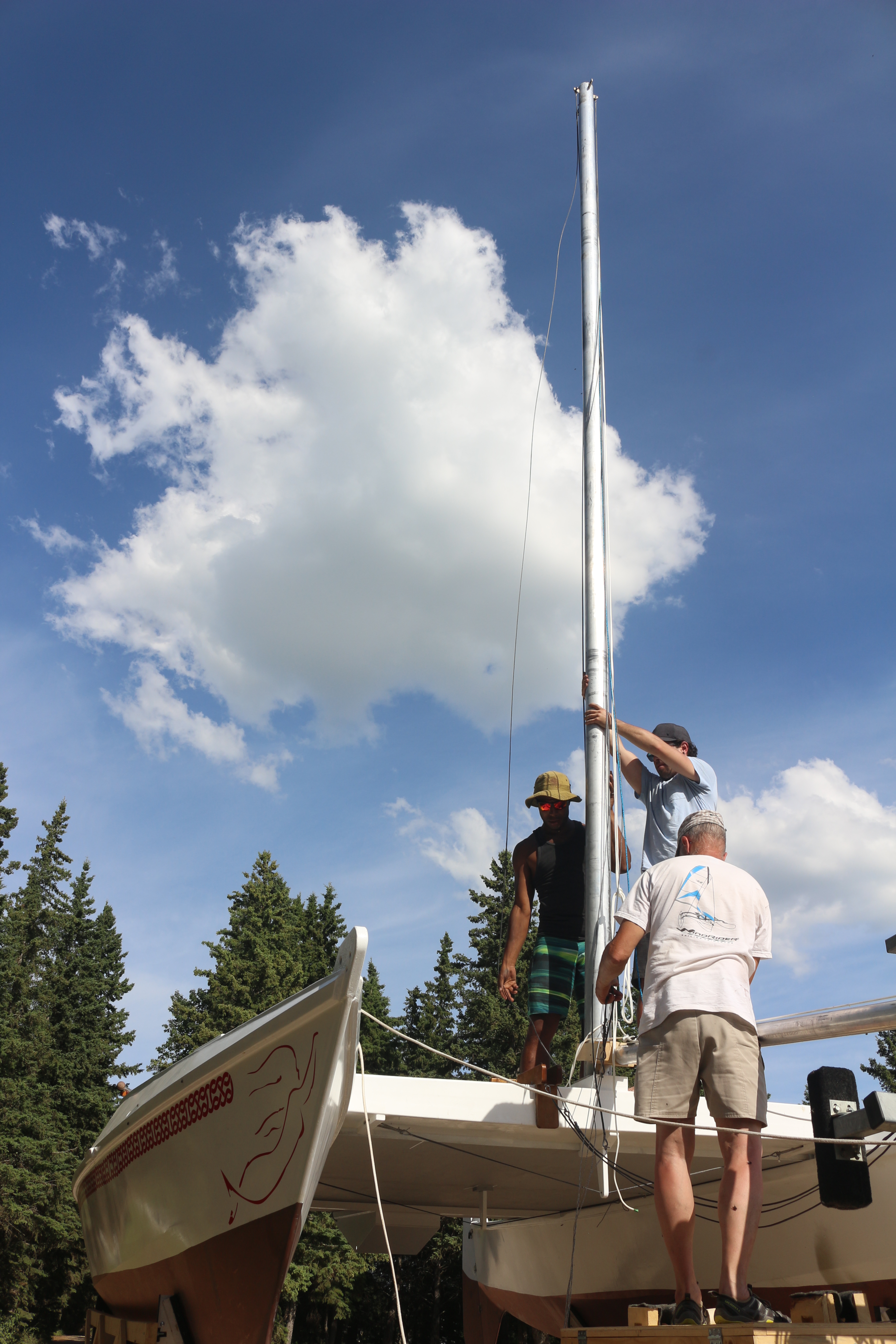 Next comes the masts. Using the mizzen mast as a temporary gin pole and the trailer winch as muscle, the main mast is raised.