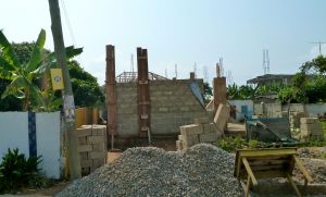 The roof in the background is for another two storey hotel which faces onto the ocean. Work on it was stopped several years ago by Town and Planning for a lack of building permit. The owner, a Ghanaian living abroad, has returned to Ghana recently and is currently in a tussle with the chief and with Town and Planning as she tries get access from her property to the roadside. Notice that her access, which was already blocked by the electrical pole now will be further limited to a narrow walkway by the new building that is underway.